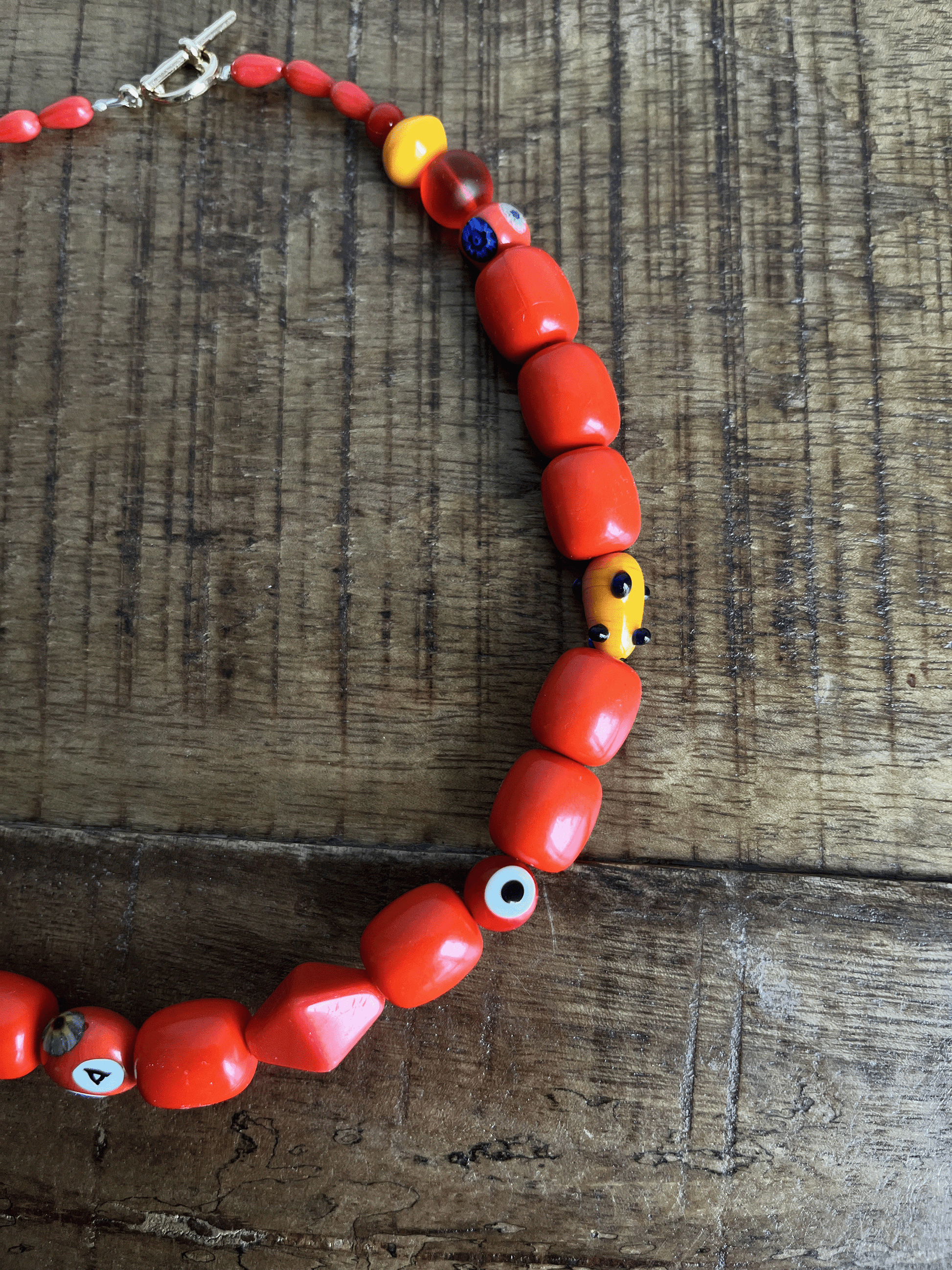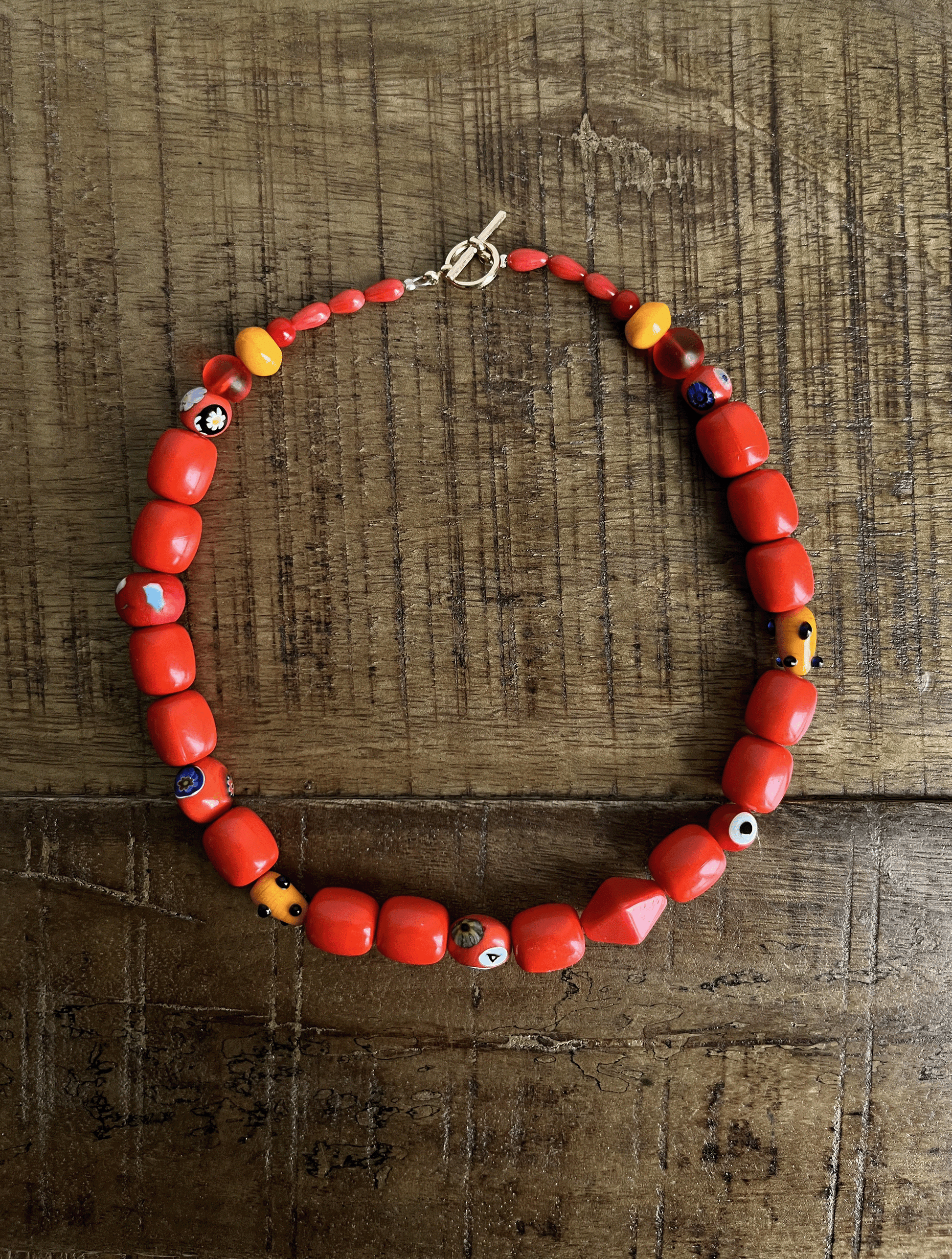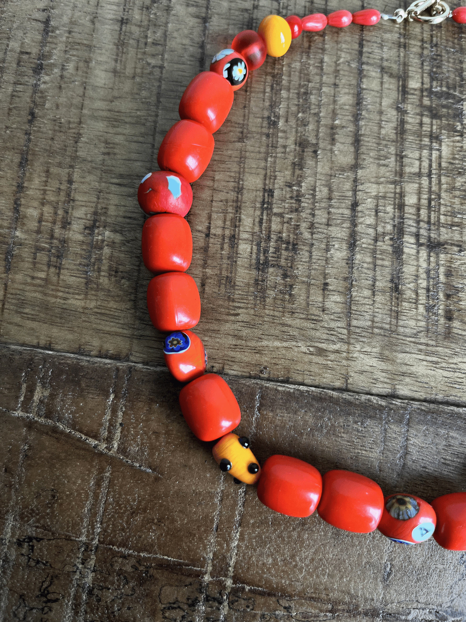 For a true pop of color, look no further. This coral-esque choker doesn't necessarily have an actual piece of coral; however, it does have those special Italian millefiore glass beads as well as fun orange glass lampwork beads. Can be worn as a choker or can add a 3 inch extender.