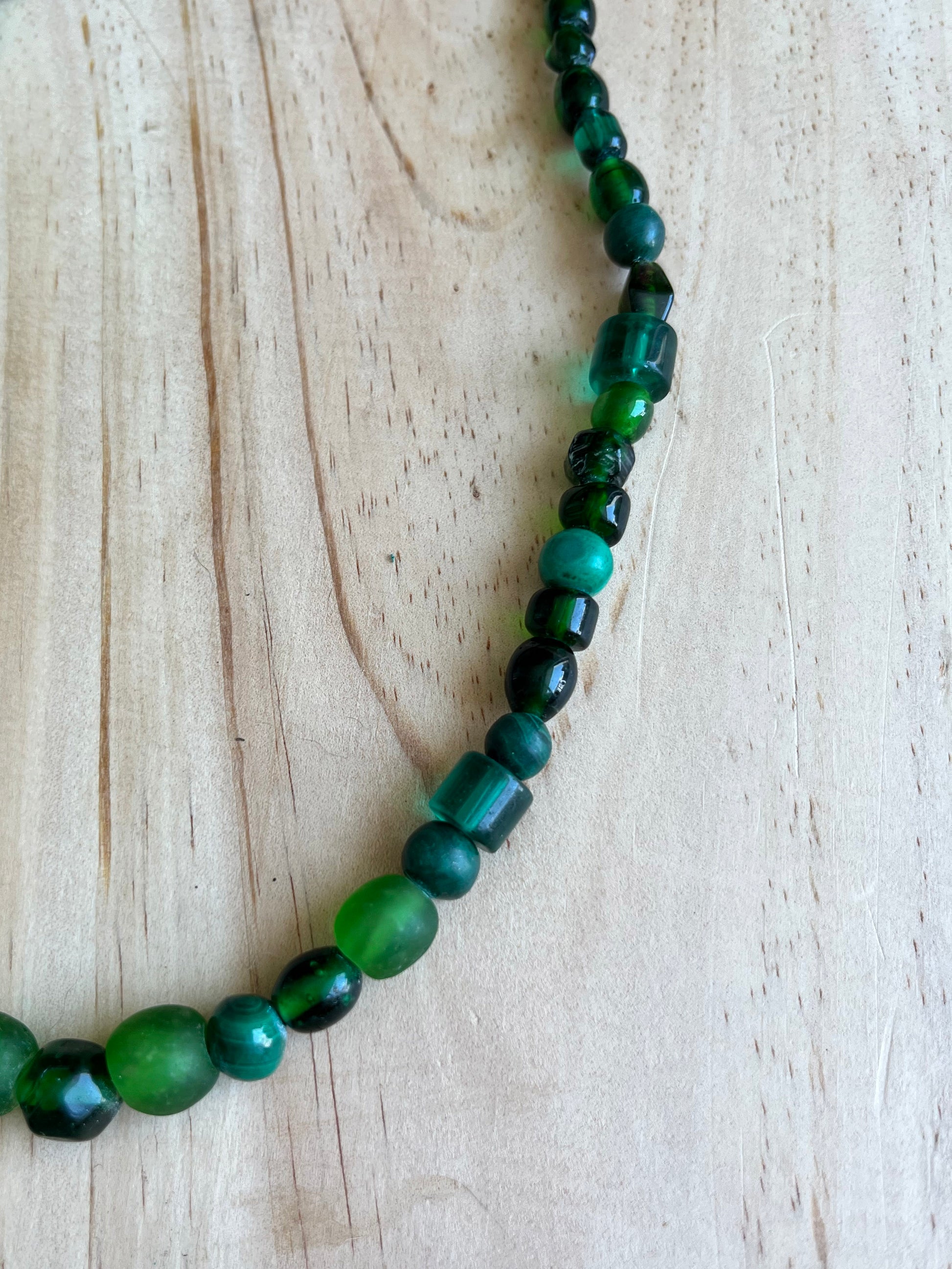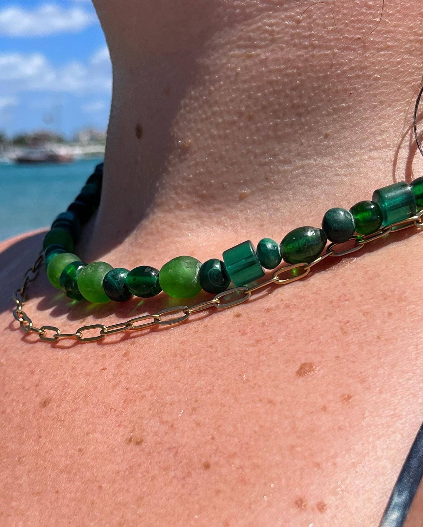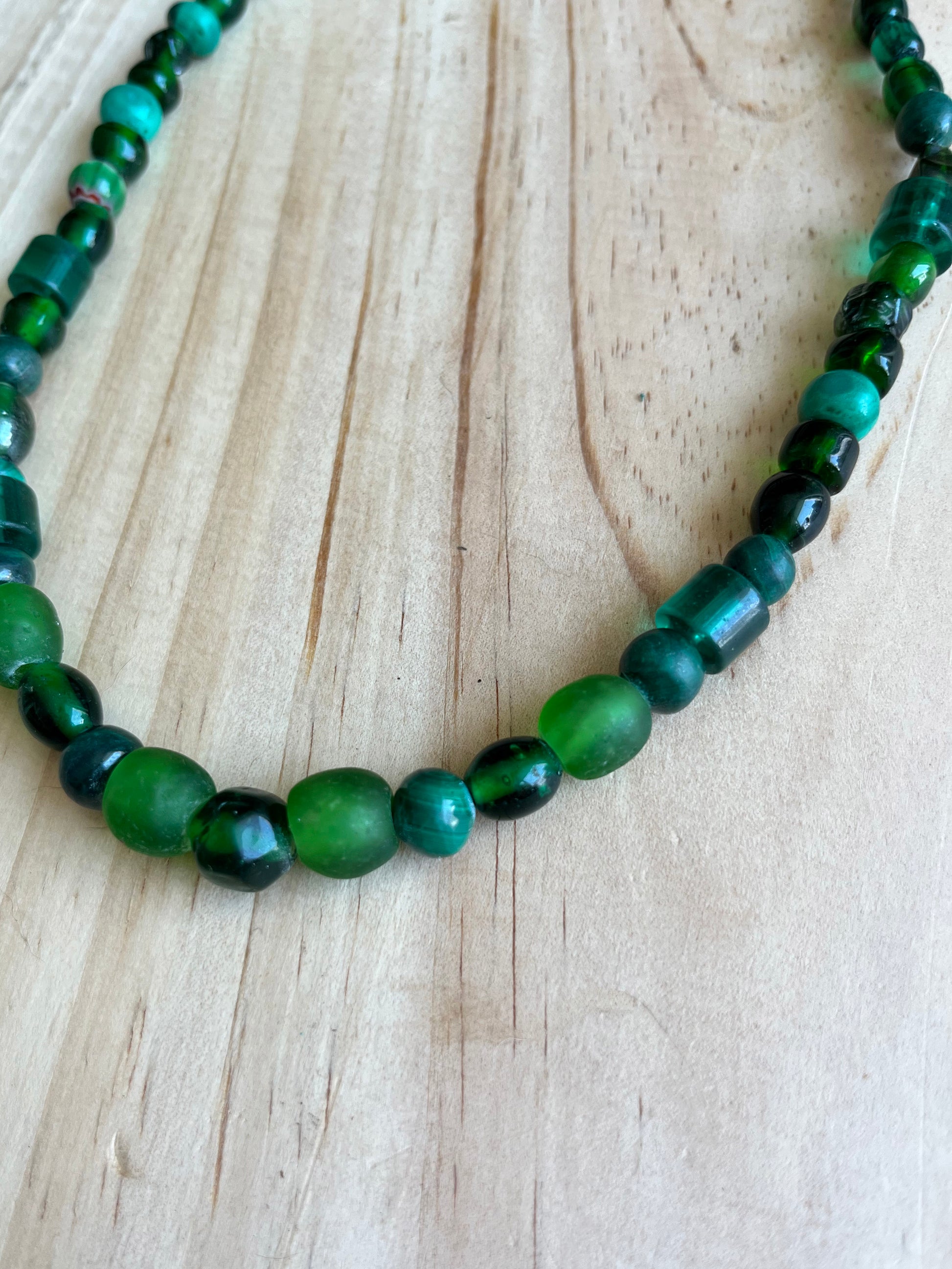 Join the movement of conscious fashion and wear an upcycled beaded necklace that not only complements your personal style but reflects your values and love for our planet! Featuring recycled, emerald green glass beads with donated malachite and an assortment of thrifted green beads. Looks amazing layered with gold jewelry.