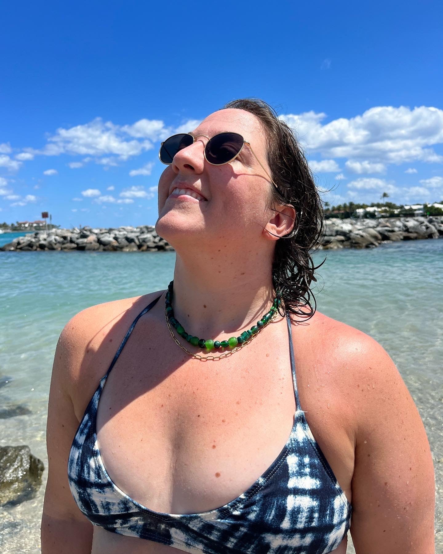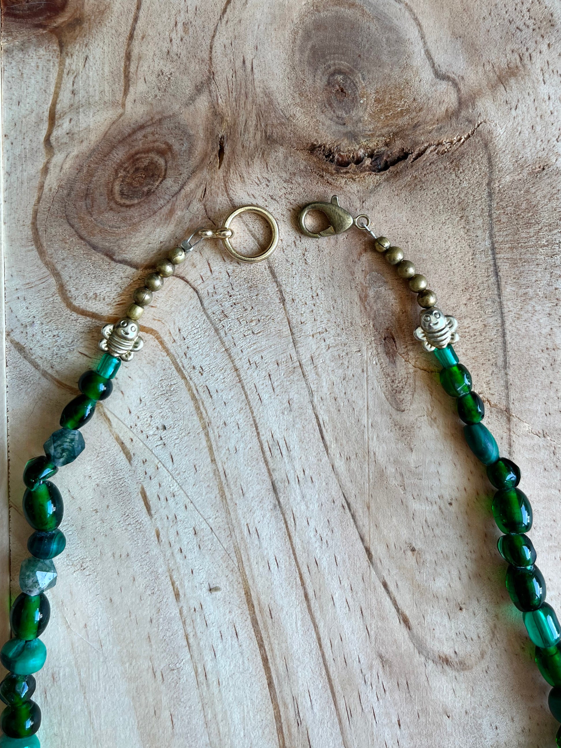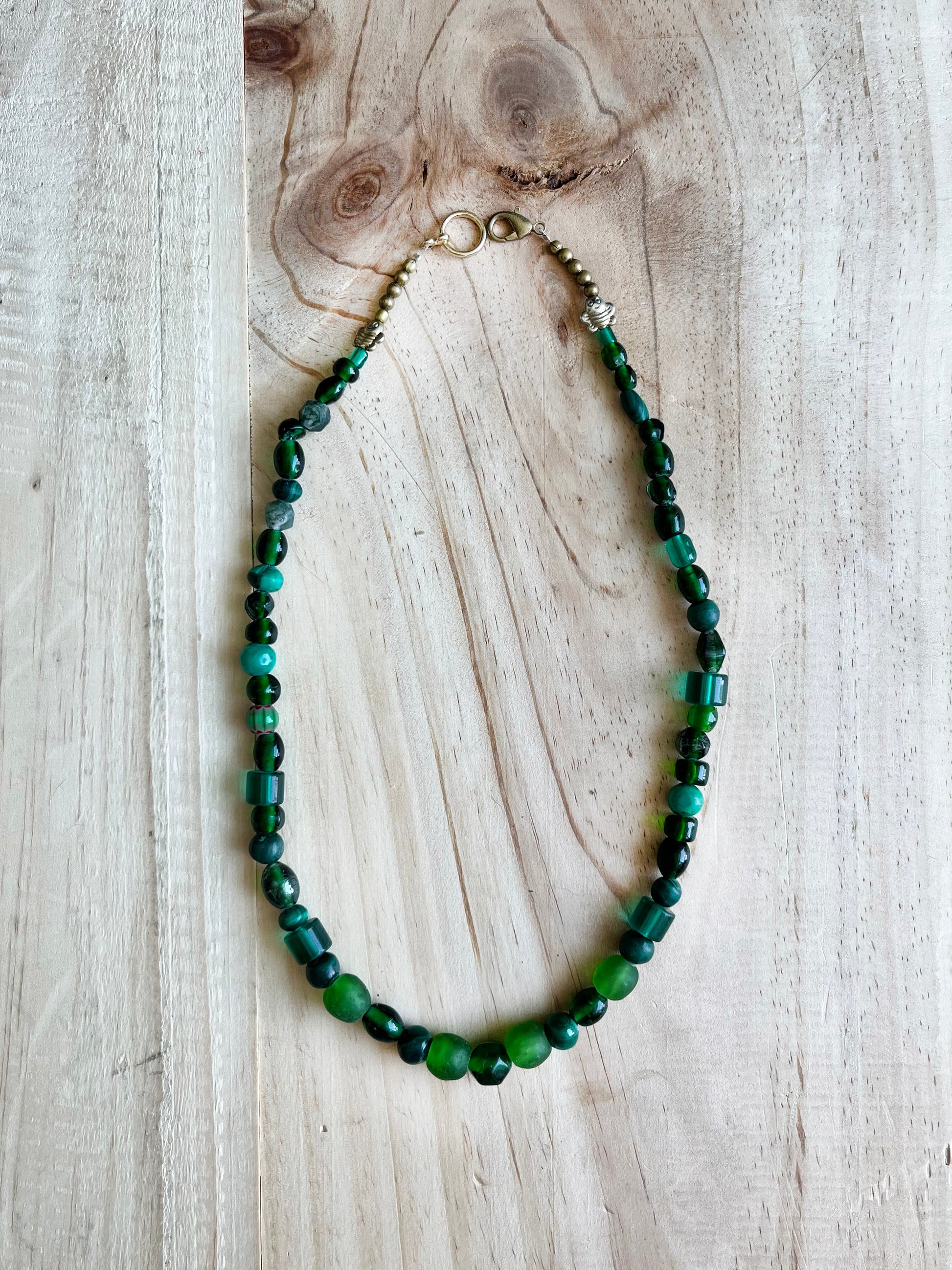 Join the movement of conscious fashion and wear an upcycled beaded necklace that not only complements your personal style but reflects your values and love for our planet! Featuring recycled, emerald green glass beads with donated malachite and an assortment of thrifted green beads. Looks amazing layered with gold jewelry.