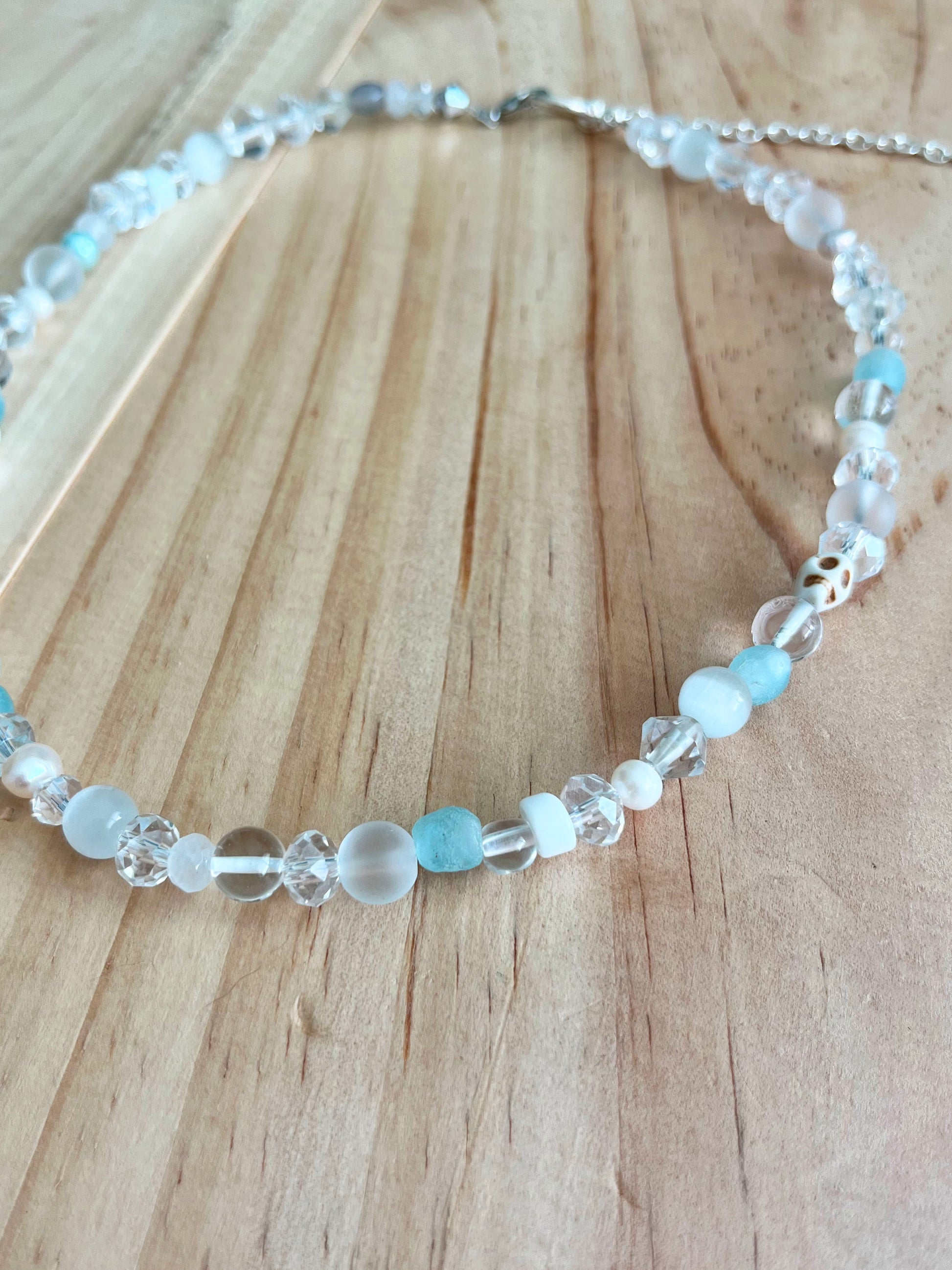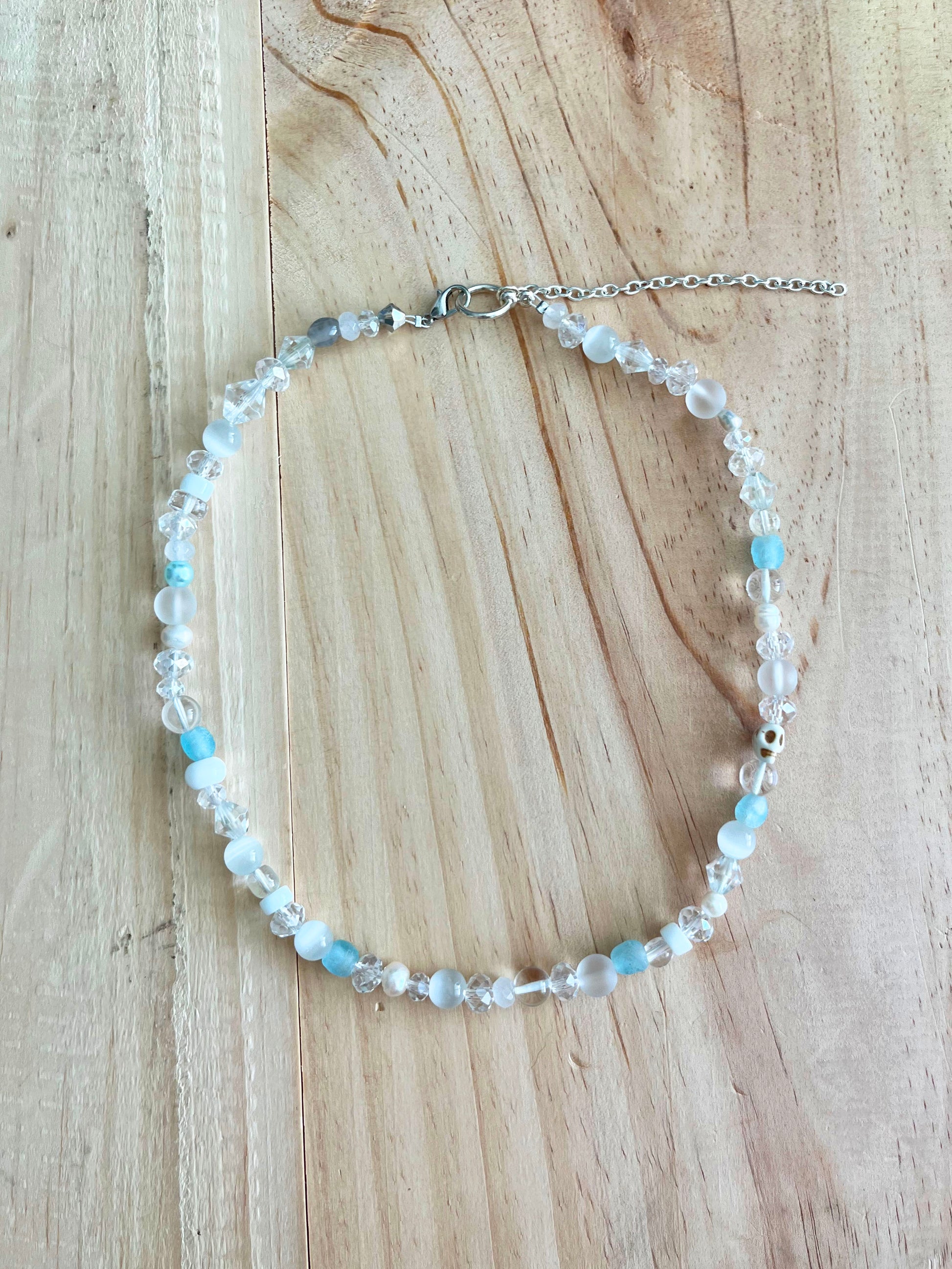Frosted but no frostbite with this icy look. This necklace not only adds a touch of cool to any outfit, but it also lets you shine guilt-free, because it's eco-friendly, baby! It's like wearing a little piece of the North Pole around your neck, but without all the chilly drama. Light blue recycled glass beads and an assortment of found clear and glass beads.