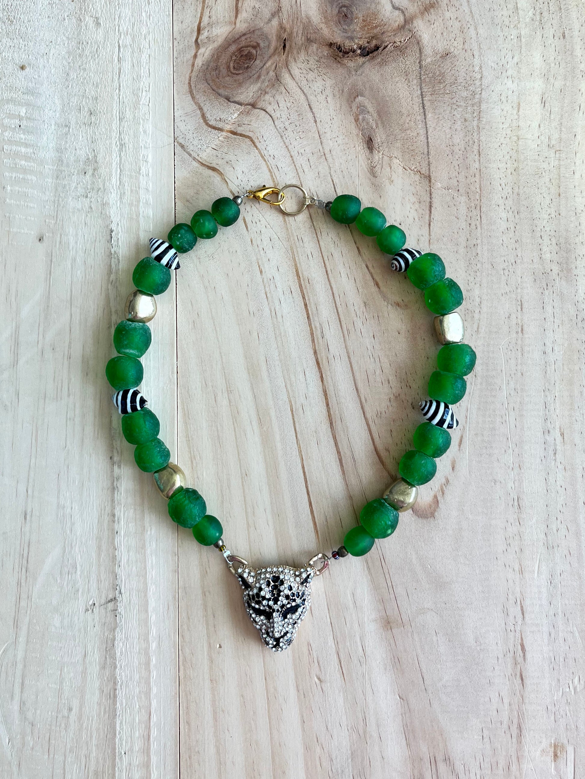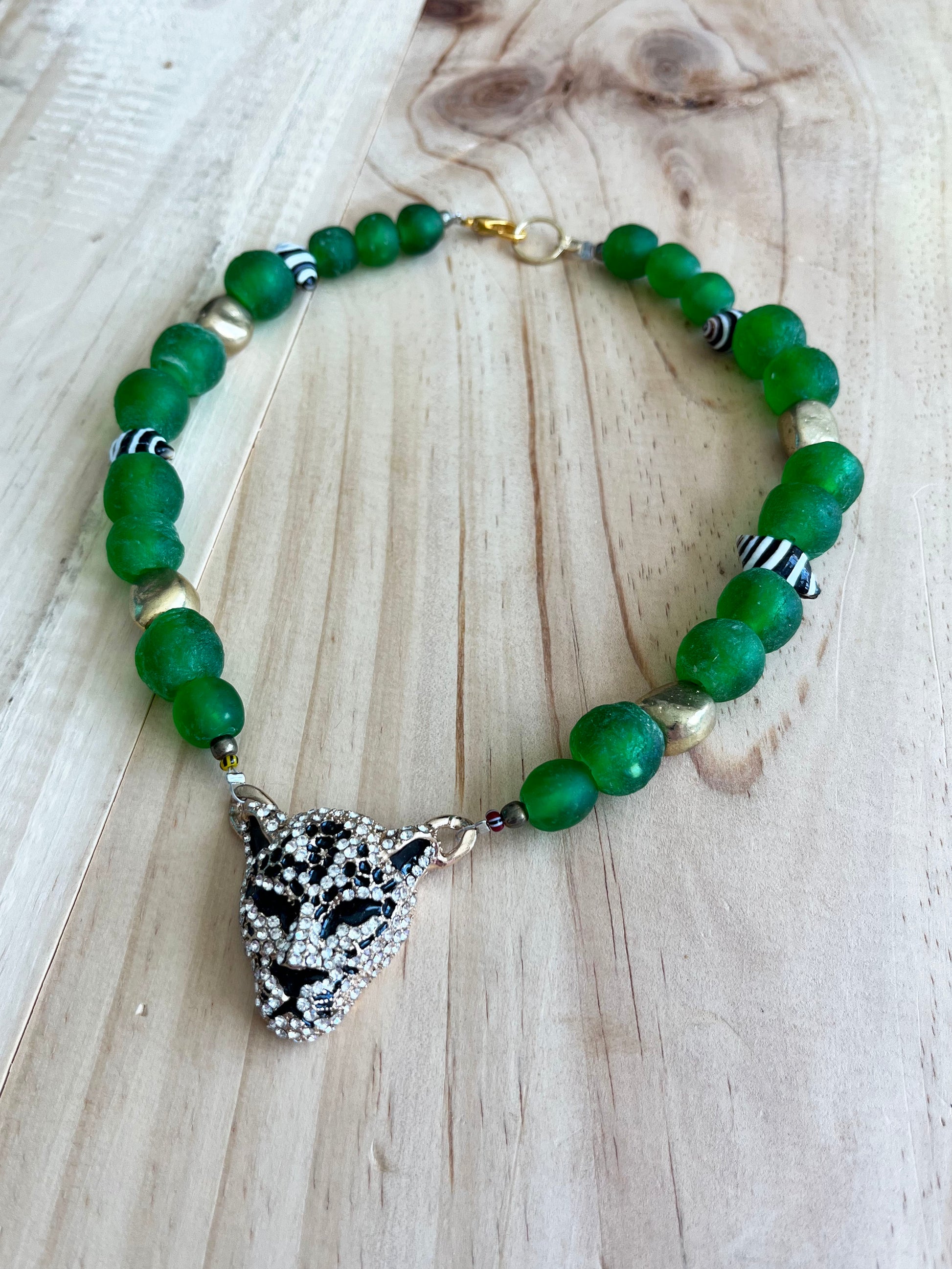 Our Jaguar Necklace features a selection of beautiful emerald green recycled glass beads with a upcycled Jaguar pendant and zebra seashells, each component tells a story of environmental mindfulness while embracing the opulence of South Florida's iconic style.