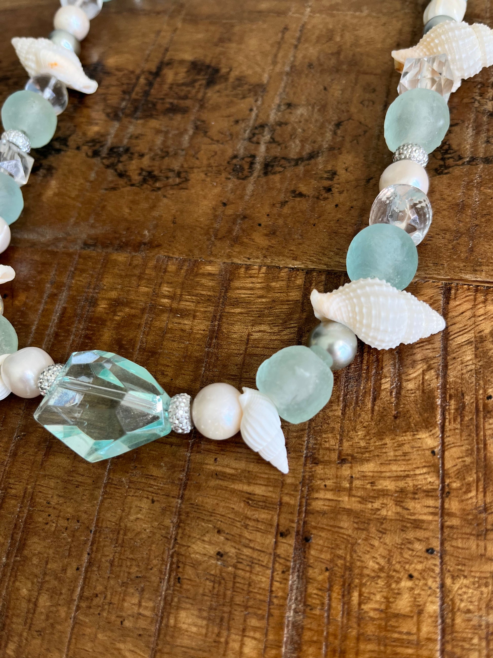 Introducing the stunning Seaglass Necklace! This mermaid-chic piece is exquisitely handcrafted with a mixture of recycled glass beads and fresh water pearls, giving it unique and eclectic charm. The Seaglass necklace is the perfect addition to any mermaid enthusiast's collection! As no two necklaces are exactly alike, you can be confident that you are wearing a truly unique piece of art that carries its own story.